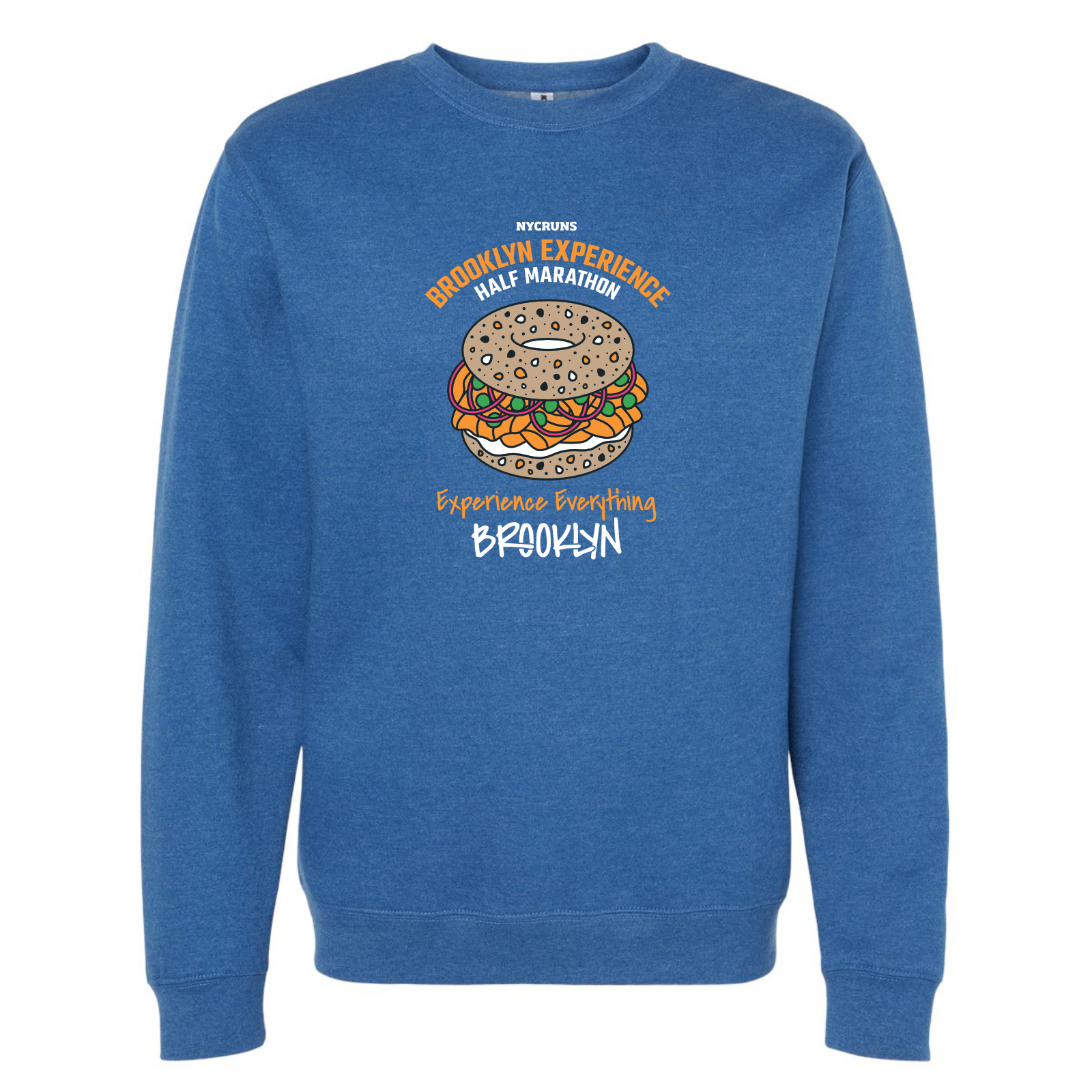 PLEASE ALLOW 4-6 WEEKS FOR THIS ITEM TO SHIP Brooklyn Experience Half Marathon Bagel design. Timeless classic crew sweatshirt in a sturdy 8.5 oz/sq.yd (280 gsm) cotton/poly fleece fabric, with split stitch double needle sewing on all seams, ribbing at collar, cuffs, and hem. Adult Unisex Standard fit. Item ID bmot913216n